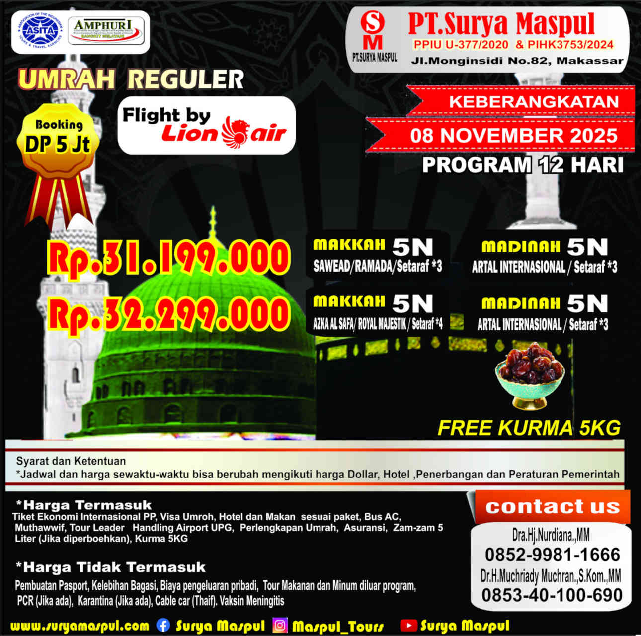 Kontak PT. Surya Maspul Insya Allah kami siap mendampingi dan melayani dengan baik demi kenyamanan perjalanan ibadah anda di tanah suci. Online Reservasi Pilh Paket-- Umrah Hemat 2025 Umrah Plus Turkey 2025 Umrah Awal Musim 2025 Plus Thaif Umrah Awal Musim 1447H / 2025 Haji Khusus 2025 Umrah Plus Thaif 2025 Haji Mujamalah 2025 Umrah Awal Tahun 2025 Umrah Sya'ban 2025 Umrah Reguler November 2024 Umrah Awal Musim 1445H Umrah Plus Aqsa & Jordan Umrah Syawal 2024 Umrah Plus Kairo 2024 Trip 3 Negara (Agustus 2024) Kirim Kantor Cabang Kabupaten GOWA : Jln. Sultan Hasanuddin no.123, Pandang-Pandang (Samping Bank Mandiri) Kabupaten MAROS : Jln. Poros Maros No.KM 21, Mandai Yogyakarta : Jln. Perum Seturan Blok E3 No. 48, Sleman Klaten : Jln. Manisrenggo KM1, Tlogo, Prambanan, Klaten, Jawa Tengah